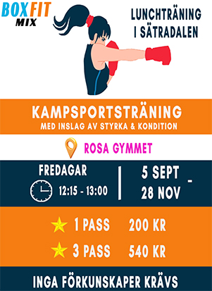 Sugen på att träna på lunchen? Kom och träna BoxFit Mix med oss.Ett kul och utmanande pass på lunchen med fokus på: Föranmälan krävs då det är begränsat antal platser. Anmälningsformulär: Betalning för ett tillfälle sker på plats via antingen swish eller kortbetalning.